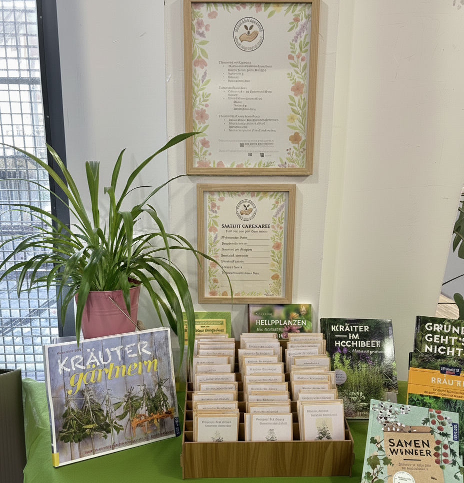 Die Suche nach einem Kooperationspartner wurde unverhofft schnell und erfolgreich beendet. Der Wunschpartner – die Stadtbibliothek Freising – hatte schon länger darüber nachgedacht, eine eigene Saatgutbank ins Leben zu rufen. Da kam unsere Saatgutbank wie gerufen. Seit Anfang Dezember 2025 bekommen nun Besucher auch Saatguttütchen mit seltenen und alten Sorten im Tausch gegen ihr eigenes sortenreines Saatgut. Die Idee findet großen Anklang. Das Sortiment durften wir bereits nach 3 Wochen neu auffüllen.